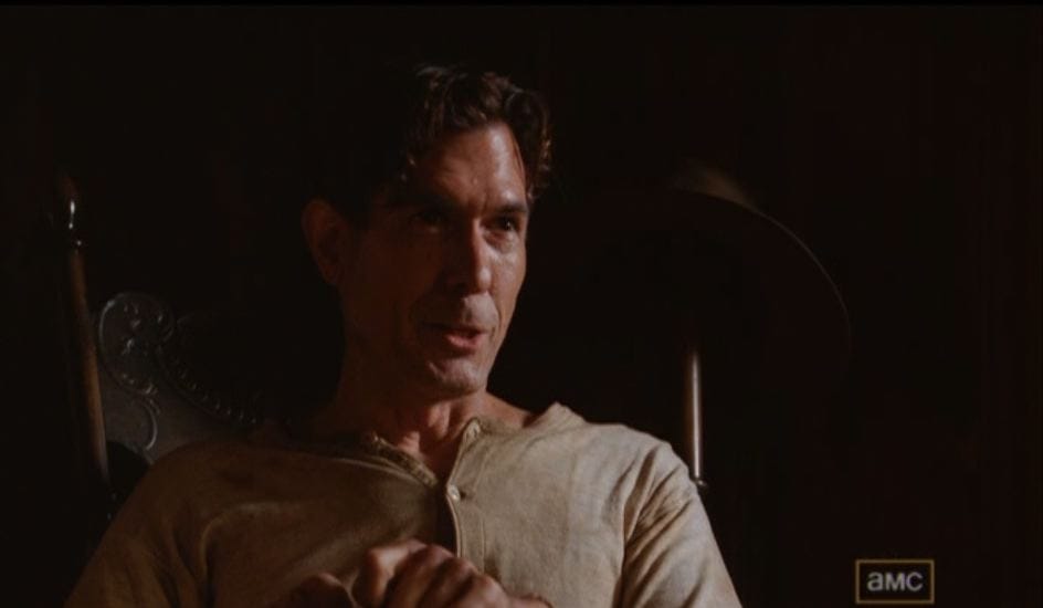 Because most of Dick's appearances in the first two seasons were in situations where Jon Hamm got to play him as vulnerable, even tender (think Don-as-Dick in Anna Draper's house), it's easy to forget just what a bastard he is. He's the one who coldly stole the real Don Draper's life without thinking of the consequences, the one who chased away his own brother to protect his secret, the one who makes Don hold himself at such a crippling distance from his wife. And Dick Whitman is the one whose first impulse at a sign of trouble is to bail on everyone who cares about him. As Jon Hamm put it to me, "When Don's in trouble, Dick runs."