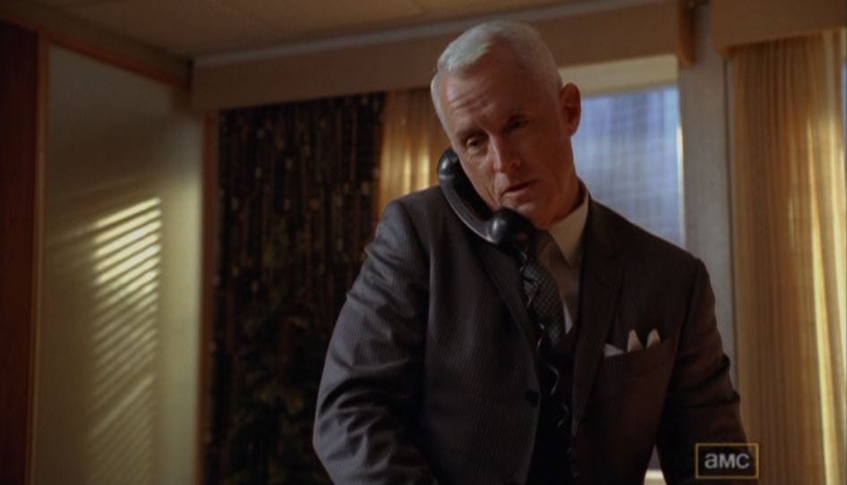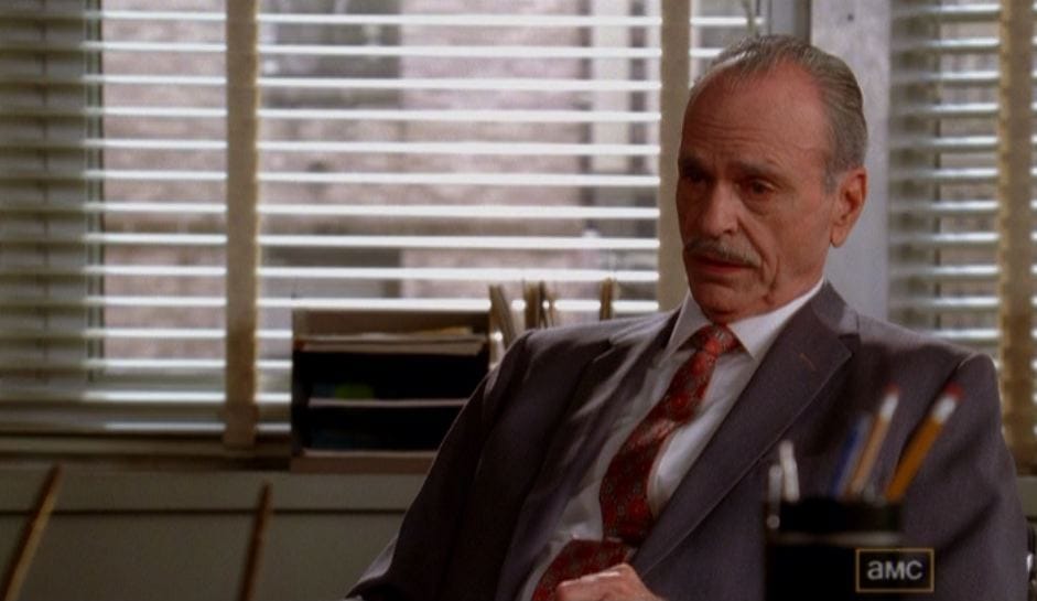 • You understand why the intensely private Don would want no part of Roger anymore, but it's a plus for the viewer that Don won't be starting up his own shop, because we get to keep enjoying John Slattery's knack for saying the most obnoxious things - the line about Don's name being on the sign, but only after his, "and probably Cooper" - and seeming charming doing it.