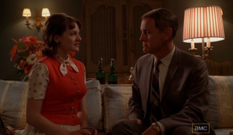 The episode itself starts with the indirect approach, as we get glimpses of Betty, Peggy and Don in situations that won't explain themselves until much later in the hour. It's not really necessary - I'm not fond of non-chronological storytelling, or in media res openings, unless they reveal something that wouldn't have been apparent had the episode been told in a traditional way - but it at least sets the tone for another intense, unsettling episode.
