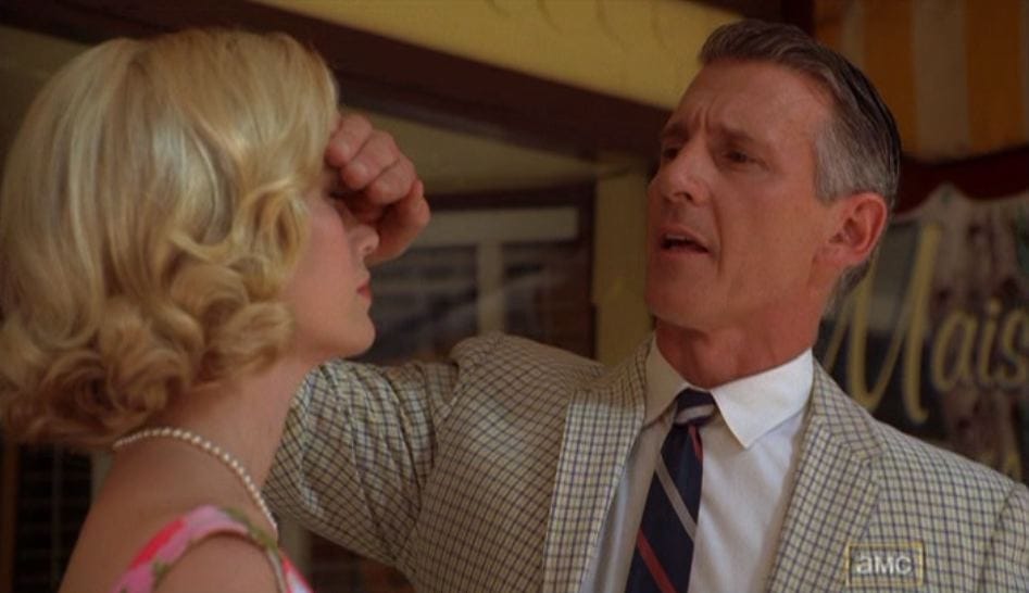 Betty, having realized that the baby isn't going to fix her marriage, is eager for the opportunity to do business with the very interested Henry Francis (who touched her belly at the same party where Don met Connie), and she and Henry flirt with each other without either one coming right out and admitting that they want to jump the other's bones. The closest they come is when Betty calls Henry out for knowing in advance that he wouldn't have time to see the endangered reservoir, and he cleverly changes the subject to the fainting couch in the furniture store window. And Betty, interested but maybe not ready for another affair just yet, can at least buy the couch so she can lie on it and fantasize about him (while looking like a character out of a Renaissance painting).