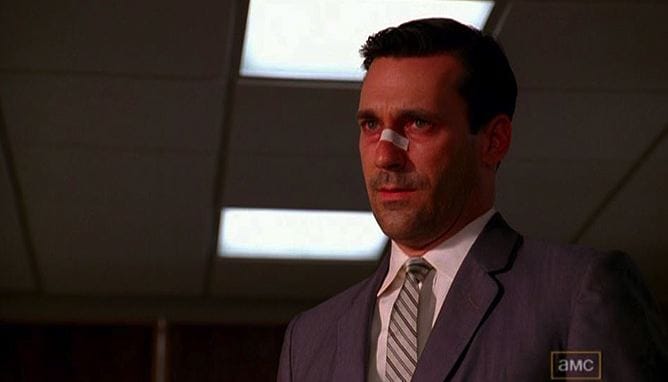 • Hard as it is to see Don rip into Peggy, it's more than a little amusing to see the two of them awkwardly come face-to-face the next morning: Don with his busted nose, Peggy wearing the same clothes from the day before after doing the walk of shame from Duck's hotel. Now, does Peggy have the apartment with Karen yet? Was there no time to go home and change? The Pierre is at 61st and 5th, and Sterling Cooper is on Madison between 47th and 48th; I suppose it's possible that the apartment, if she has it already, was in the opposite direction.