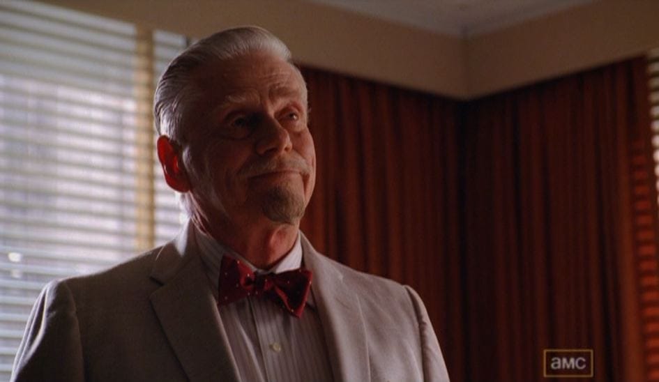 The man Dick Whitman turned himself into is a master of the universe, capable of playing all the angles and finding a way to win the unlikeliest of victories. But here, we see other men sitting in Don's chair, putting him ill at ease and telling him how his life is going to be. Connie makes it clear that, however they bonded at the country club, he's going to dictate the terms of this relationship. And Bert Cooper turns out not to be the doddering eccentric we've taken him for, but an absolute killer. He's had the Dick Whitman card in his pocket since the end of season one, but he's declined to play it until now, going straight at Don with it, yet being elegant enough to phrase his attack in an oblique way. (He paraphrases a line he used on Don in last season's "The Gold Violin" about how he knows a little about him, then asks, "After all, when it comes down to it, who's really signing the contract, anyway?")