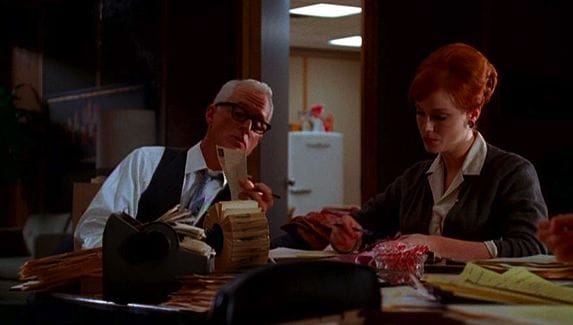 • Even though I assumed Joan would wind up back at the company sooner or later, I did a massive fist pump when Roger went to "make a call" for someone to help with the raiding of SC materials, because I knew exactly who'd be on the other end of the line. Joan gets to make her grand entrance, and then we get to see her and Roger acting like an old married couple as he complains about her handwriting. Whether or not they're The One for each other, the two (both characters and actors) work together incredibly well.