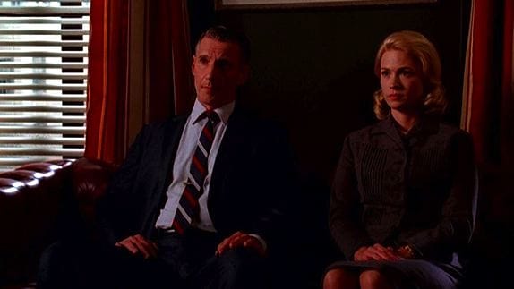 Over and over in "Shut the Door. Have a Seat," characters are told some variation of the episode's title, and they sit and hear some life-changing bit of news: that St. John is selling all of PPL to McCann Erickson; that Betty has hired a divorce lawyer; that Don, Roger and Bert are determined to buy the company back; that Betty won't have an easy time of divorcing Don in New York; that Don wants Peggy to quit Sterling Cooper and come with him; that Don and Roger need Pete to come on board; that Bobby and Sally's parents will be separating; and that Don, after being an aloof bastard to Peggy for most of this season, will do anything to get her to go with him to join the new firm.