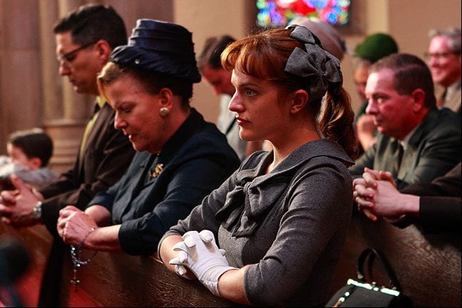 Anita, though, sees Peggy for who she really is: a girl who slept with a married (or, initially, engaged) man without thinking about the consequences, and who seems perfectly happy to use her psychiatric diagnosis as an excuse to avoid future responsibility. What Anita does to Peggy in her confession to Father Gil is awful and manipulative, but I can sympathize with her resentment. Now, in a different time, and/or a time when Peggy wasn't so naive that she didn't recognize what was happening to her body until it was too late, Peggy might have gotten an abortion or arranged to give the kid up for adoption, and it's not like she chose to have the kid placed with her sister. But it's still her son that Anita has to raise, and Peggy does her best to act like that isn't so, and if I was Anita -- the "good" sister who plays by the rules and takes responsibility for the entire family -- it'd drive me a little nuts too, you know? (Especially if I was as devout as Anita and I saw the new priest paying more attention to my wicked sister than to me.)