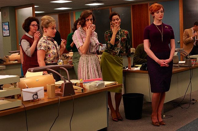 • So much wonderful, largely wordless stuff with the secretaries during the Sunday cram session, whether it was them swooning over the sight of Don bringing his little girl to the office, them gazing with frustration at having to wait their turn at the buffet, or especially them giving former secretary Peggy the stinkeye while she enjoys her dinner.