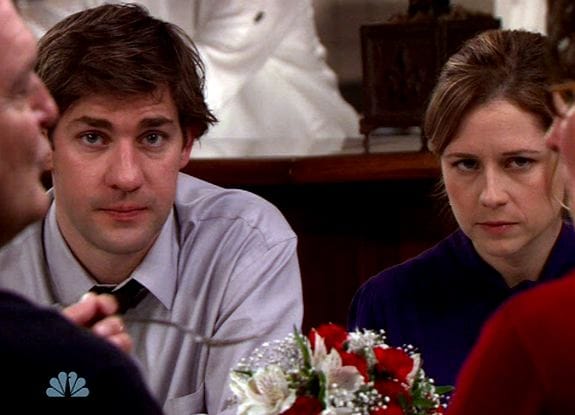 Jim and Pam's double-date with Phyllis and Bob Vance (Vance Refrigeration) was also fun, particularly PB&J's dismayed/angry reaction when the two lovebirds returned to the table (see above).