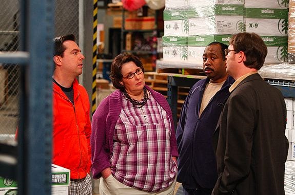 And if there was a downside to the MSPC storyline, it was the marginalization of the D-M supporting characters. After sitting on the sidelines for the last few episodes, everybody got a moment to shine, whether it was Meredith obliviously (and repeatedly) flashing the office, Phyllis turning sweetly vicious to Pam ("Close your mouth, sweetie. You look like a trout."), Toby taking charge to shut down Casual Friday (and Meredith being turned on by his assertiveness) or, hysterically, the teaser scene with Kevin's homemade chili. (What made that so brilliant was that they kept playing the audio of Kevin excitedly describing the chili even as we saw him in the present desperately trying to get it back in the pot before anyone else came in to notice.) These actors are all too funny -- and, when needed, good actors (like Phyllis getting to Michael with her rant about how they're supposed to be a family) -- to be marginalized for too long.