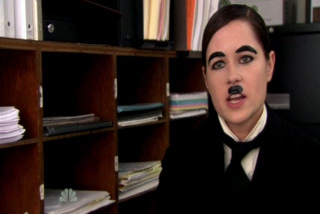 If I have a problem with the episode other than the departure of the perfect Amy Ryan, it's that there weren't enough laughs to compensate for the darkness of the Michael/Holly story. Jim and Pam's lunch date with his brothers -- both of them fighting to play the role of Roy -- was largely uncomfortable. And while there were some funny spots in Dwight attacking Andy through his Cornell obsession, something felt off to have Dwight playing the role of Jim -- and playing it so well, when we know Dwight both despises Jim and isn't good at imitating him. I think it might have worked better if it had been part of a more extended Halloween gag, though it would have deprived us of seeing Dwight as our third Heath Ledger Joker. (Then again, Creed's Joker was funny and terrifying enough to compensate.) On the plus side, it would have meant that Pam would have had to go to lunch with Jim's brothers while rocking the Chaplin/Hitler mustache. Ah, well.