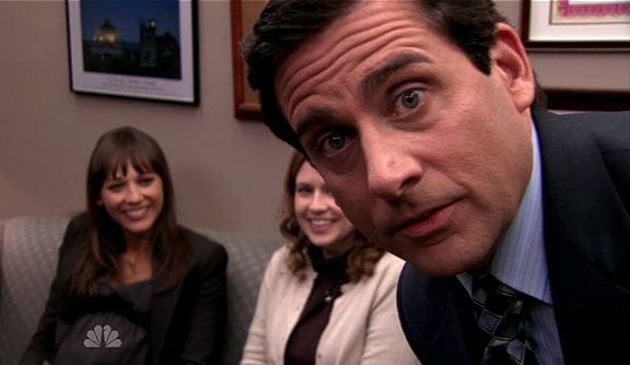 • In a bit of a callback to "Business School," Michael's still using candy bars as lecture props. I loved how Pam just threw them at the Utica people with no enthusiasm, knowing she had to as Michael's lovely assistant but realizing how poorly it would go over.