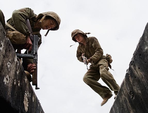 • McKenna wrote the "Bastogne" episode of "Band of Brothers" that focused on combat from the point of view of the company medic. Here he echoes that idea with the sequence where Sledge has to serve as a stretcher bearer, running frantically through the field of fire, in as much danger as the other Marines but not in a position to fight back.