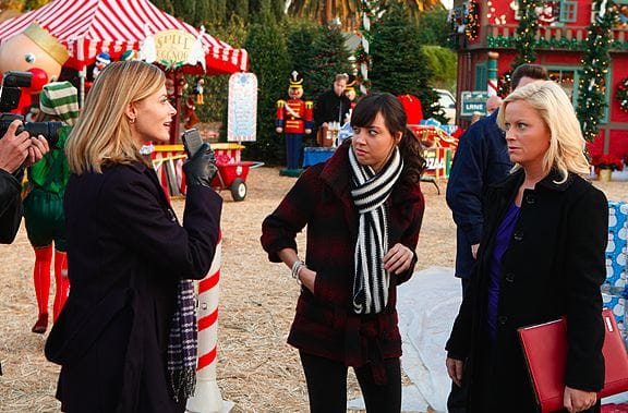 Though I ultimately enjoyed "Christmas Scandal," I thought the main plot about Leslie being embroiled in Councilman Dexhart's scandals didn't really work. The central conceit of the series is that Leslie treats her mundane, small-town civil service job as if it were a high-stakes national politics job, while everyone else sees their world for what it is. "Christmas Scandal" was the exact opposite of that. There were certainly some funny moments as Pawnee turned into a scandal factory - complete with its own tabloid and the cable access show turning into a cross between Nancy Grace and Fox News, and with Leslie dropping trou to make the problem go away - but it was all so counter to what the show is about that I was distracted by it.