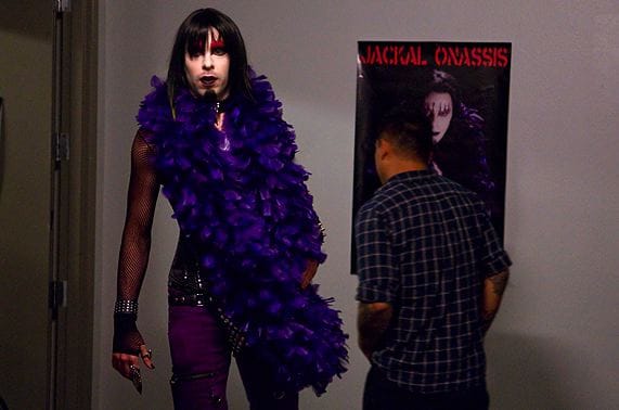 So because I didn't love the new arrangement, and because Mullally was largely off to the side, it was left to the Roman/Kyle duo to largely carry things. And, fortunately, Roman's complete and utter loathsomeness was up to the challenge, as he discovered that women preferred Kyle to him even when he was disguised as a popular, lady-killing Marilyn Manson-type rock star(*).