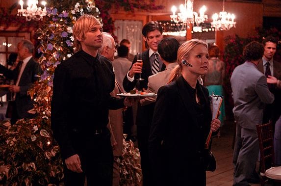 Rob: I had the best time. It feels like the way I normally write, with the boundary on the comedy side expanded a bit further. I'm thinking in particular with how pleased I was with the pancake lady story (in the investor's dinner episode). That's something I couldn't quite do in "Veronica Mars," but the boundaries in "Party Down" allowed for an anecdotal story that doesn't move plot in any direction. Something that's so hard to do in normal network television. You always feel like you're having to drive a story point, this scene will link Part A to Part B, I don't get the opportunity to just tell a two-minute anecdote using pancakes and sex metaphors. It was liberating in that sense. And having written both comedy and drama, comedy's harder, because the fear of failure's so much stronger. When you write a scene and you see it cut together, and it doesn't make you laugh, it hurts in a way that failed drama doesn't. Failed drama, it's all, "that's not that compelling," but failed comedy just lays there. The investor dinner episode, there are a couple of moments, when they're having the conversation about Baretta's gun, and we cut inside the house, and there's about two minutes as they just go into that mansion that just feel flat and painful, and I go, 'Oh, just please...' Things I thought were funny on the page weren't funny. It hurts as I watch the episode. But honestly, the joy of seeing Jane Lynch take the "Old McDonald" scene -- when I wrote that, I thought, 'Oh god, I hope this works. Because that will be so ugly if it doesn't work.' But you're putting it in Jane Lynch's hand. I'm so oddly proud of myself when I watch that scene, because I'm watching comedy for comedy's sake, as opposed to "Veronica Mars," where I feel like I'm writing "Heathers."