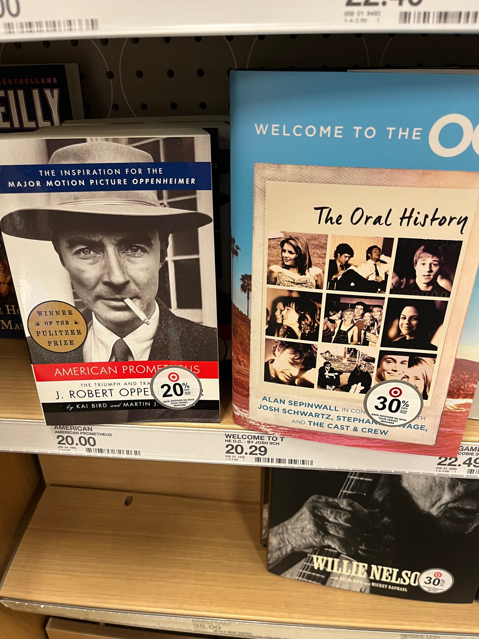 Welcome to The O.C. remains available wherever books are sold, and that includes a few locales where I’ve never had my books appear before. One is airports, since Hudson News is stocking the book. The other is Target, which I’m told is a very tough place to get a book shelved. So that’s exciting. In fact, I got to see it on the shelves at our local Target over the weekend, and was amused by the placement: