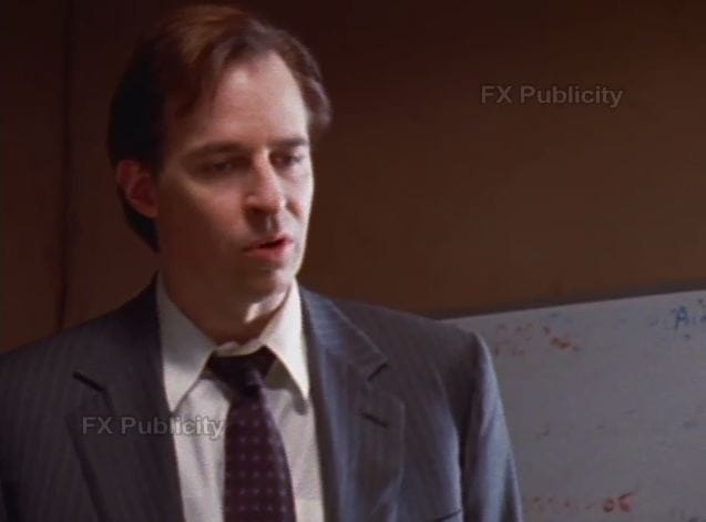 • I loved how much smaller Vic seemed in that suit (I suspect the wardrobe department deliberately picked out one that was a size or two too big), and how pained he looked throughout the HR reps' tour of his new hell. Note that for help, he now has to dial 912 instead of 911.