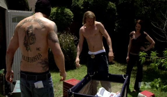 And to continue being fair, Jax is turning out to be more complex than advertised. He isn't just the pacifist in the violent organization; he's among the most eager to see Kyle's tattoo removed by any means necessary. (Fire or knife? Hell of a choice.) I was wondering why they were spending so much time showing Opie and Jax shirtless in the early going, but it became clear when you saw how much that tattoo means to the members of Sam Crow. Meanwhile, the money launderer with the unfortunate compulsion added a bit of comic relief to a show that hasn't had a whole lot so far.