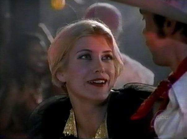 The one somewhat sad story -- and, from our 2008 standpoint, the most interesting -- has Nick's array of cliched pick-up lines turn out to amuse a woman in a bumblebee costume named Heidi, who happens to be played by Adelstein's future co-star Kate Walsh, almost unrecognizable as a bohemian blonde instead of the carefully-coiffed redhead she is today. Even if I couldn't identify her by the voice, though, I think I would have figured it out in the moment where Heidi tries to encourage a sheepish Nick to dance, as Walsh uses the exact same gesture (fists together, eyebrows raised, grin enormous) that I've seen her use a few times as Addison Montgomery. (In particular, there's an episode of "Grey's Anatomy" where she gets the chief to dance that's like a mirror image.)