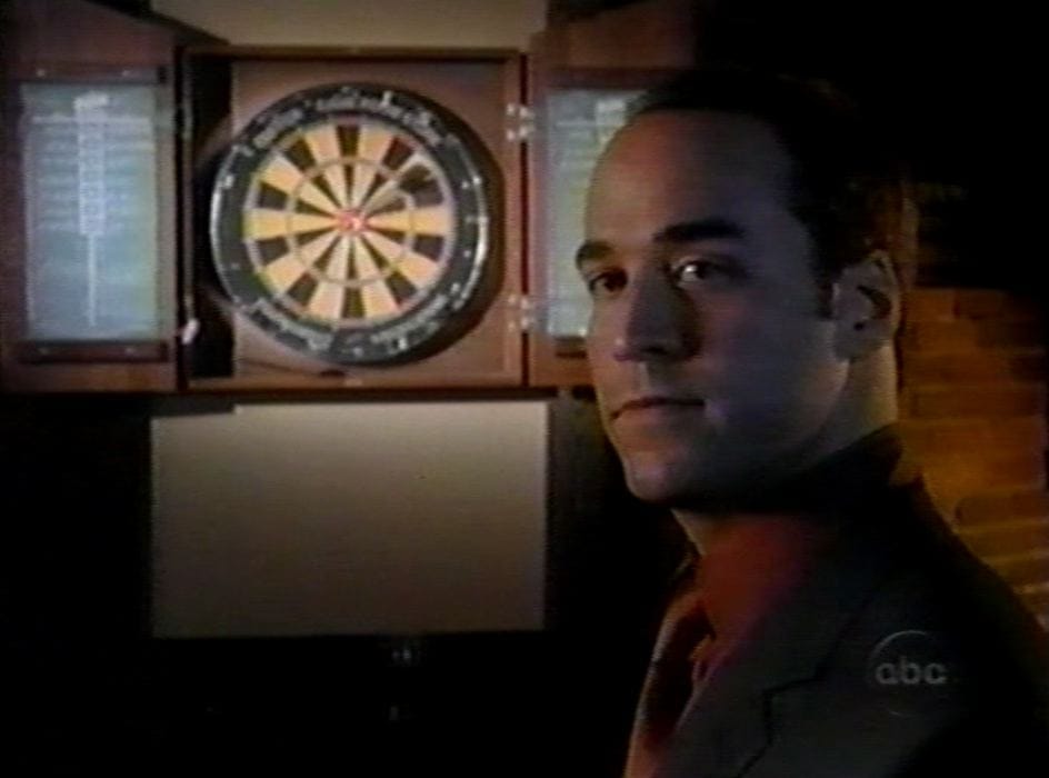 -Getting back to the dart trick for a second, it’s funny the way memory works. With the exception of “Heart of the Matter” (if you’re already a fan, you know which episode I’m talking about, and if not, you’re gonna love it), I haven’t seen any of these episodes since their original broadcasts nearly a decade ago, and I always had it in my head that Trevor made the bullseyes blind, which seemed a more blatant “He’s a god” signpost. The beer mug reflection muddies that somewhat.