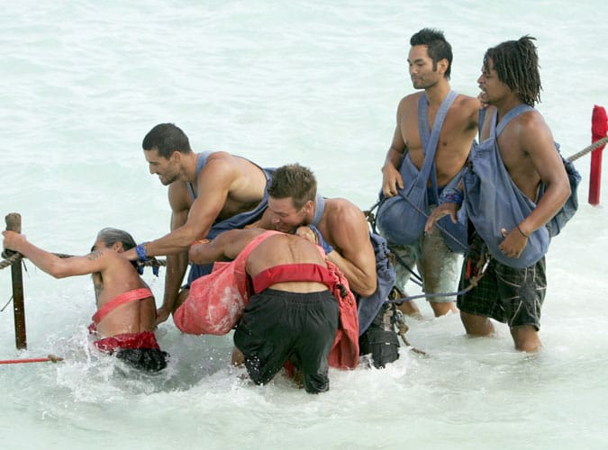 It's annoying that most of the likable people (with the exception of Nate and Cristina) wound up on the losing team, while most of the hateable people (with the exception of Ozzy) wound up on the winning side. I think Jonathan could have chosen a bit more wisely; since he couldn't choose Adam quickly and Brad couldn't choose Yul quickly, he should have grabbed Nate or J.P. for a little more team brawn. As it was, they were badly outmuscled in what was one of my favorite challenges of all time when they did it in Palau. (This was the contest that firmly established the awesomeness of Tom and Ian, and it's pretty much what Stephenie's legend was built on.) Here, it went by very quickly and exactly as you would have expected from looking at the respective line-ups.