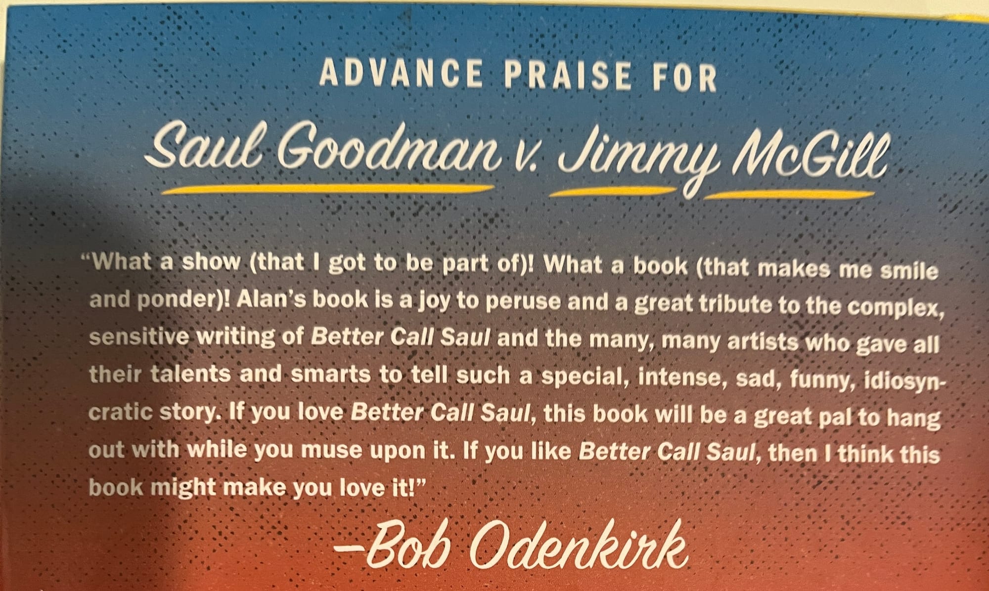Meanwhile, it’s been a busy-ish stretch for some key Saul alums. The Writers Guild of America just announced that Vince Gilligan will be receiving the Paddy Chayefsky Laurel Award for Television Writing Achievement, named for one of the giants of television’s first Golden Age, to be presented at the WGA Awards on February 15 — a week after the 10th anniversary of Saul. (And a week and a half after the release of Goodman v. McGill.) Meanwhile, Bob Odenkirk is in one of the documentaries Peacock made for the 50th anniversary of Saturday Night Live, talking about his stint as a writer during the Phil Hartman era. Oh, and Bob has a thought or two about the book, if that might help put you over the top to buying: